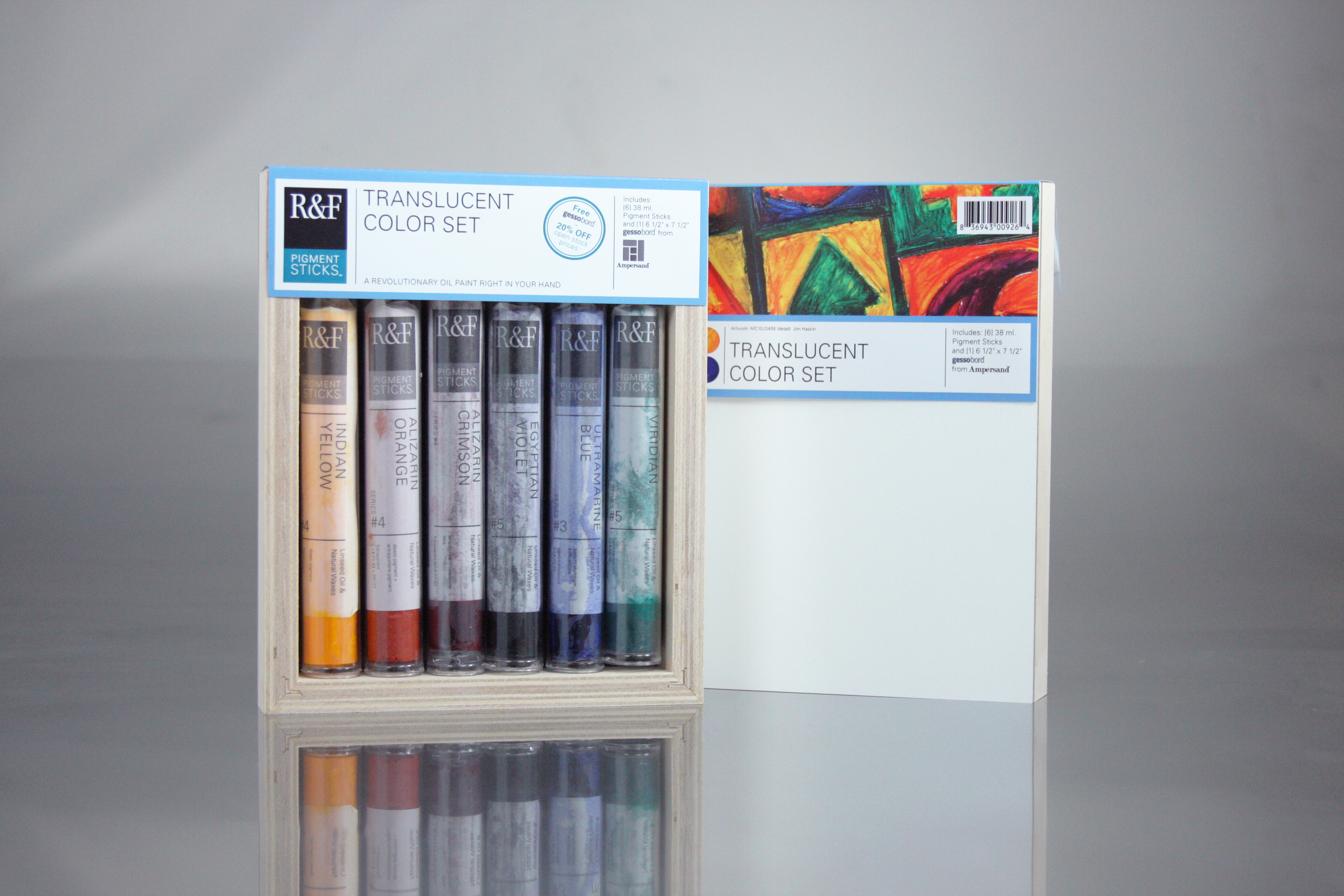 Sada obsahuje 6 ks 38 ml: indická žlutá, alizarínová oranžová, alizarínová červená, egyptská fialová, ultramarínová modrá a viridiánová + obsahuje desku Gessobord™.