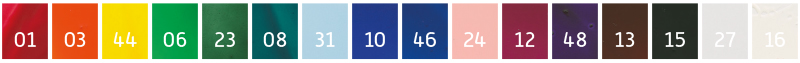 Základní sada vosků na enkaustiku. Složení barev v sadě můžete shlédnout na obrázku. (01,03, 06, 08, 10, 12, 13, 15, 16, 23, 24, 27, 31, 44, 46, 48).