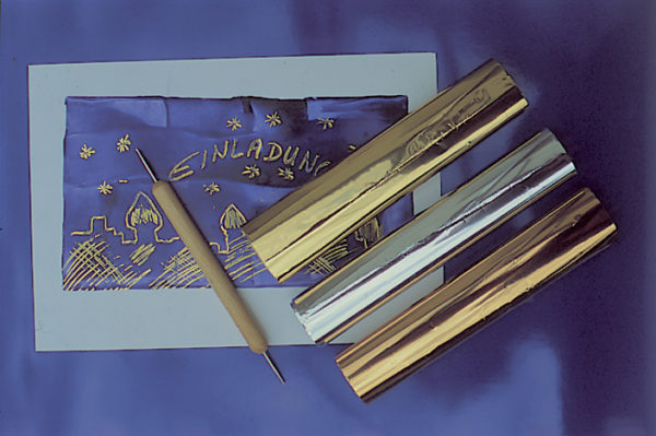 Embosovací fólie použijeme při konečné úpravě obrazu. Pomocí kovové škrabky či podobného nástroje přeneseme na obraz část folie a vytvoříme v obraze výrazný detail v barvách fólie.